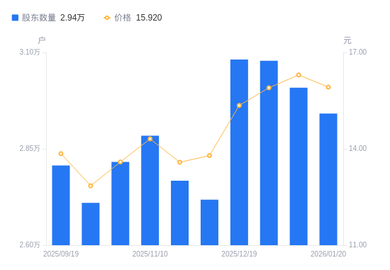 2月10日消息,数据显示,截至2026年1月30日,江苏神通A股股东总户数为2.94万户,较上期(2026年1月20日)增加21户,增幅0.07%。公司最新A股总股本为5.08亿股,其中流通A股4.69亿股,户均持有流通A股数量为1.59万股,较上期减少11.37股,降幅0.07%;户均持流通A股市值27.45万元,较上期增加2.07万元,增幅8.15%。